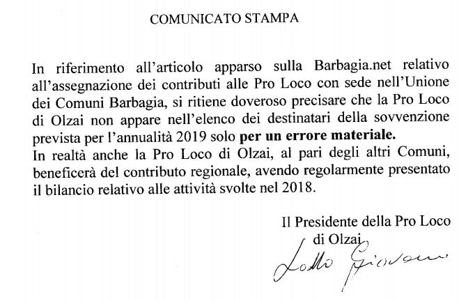 Riceviamo e pubblichiamo la nota del presidente della proloco di Olzai, Giovanni Loddo, in merito alla assenza della proloco olzaese dalla graduatoria pubblicata dalla Regione Sardegna sulla assegnazione dei contributi alle proloco, notizia ripresa dal nostro portale e pubblicata al link http://www.labarbagia.net/notizie/associazioni/13175/regione-assegnati-i-contributi-2019-alle-pro-loco-di-ollolai-gavoi-ovodda-oniferi-sarule-e-tiana.