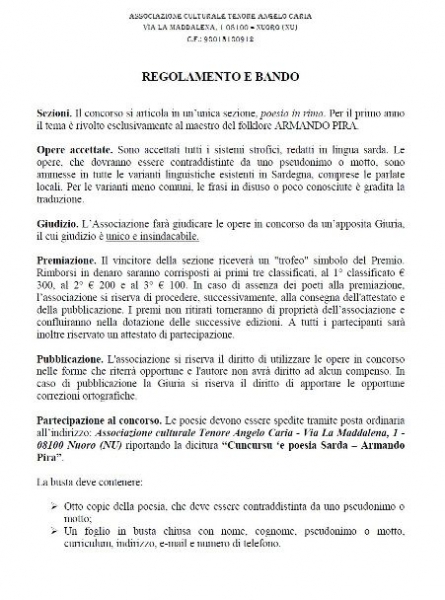 Un concorso di poesia dedicato a un uomo che della poesia ne ha fatto una ragione di vita. Tziu Armando Pira ne sarebbe orgoglioso, e ancor di più sapendo quanto la sua figura ora rappresenti un esempio per i tanti giovani appassionati. E la cultura del canto a tenore deve tantissimo a quest'uomo che negli anni si è fatto ambasciatore nel mondo del grande patrimonio sardo, con il titolo di "senatore" dell'Europeade. Fermamente convinto della sua sardità , della importanza della lingua sarda in un periodo in cui si tentava di ghettizzarla in un angolo di non modernità . Nel 1968 aprì la prima scuola di canto a tenore, con non poche difficoltà dal momento che "su uncordu" rappresentava ormai per molti un'espressione di una Sardegna antica e vecchia. Ora, quel mondo che lui ha sempre amato e sostenuto, nello specifico l'Associazione Culturale Tenore Angelo Caria, gli dedica un concorso di poesia. Il regolamento in allegato.