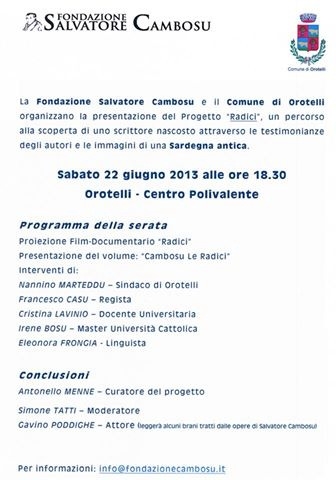 Orotelli. Sabato 22 l’appuntamento è a Orotelli per la presentazione di Radici. Si tratta del progetto, promosso dalla Fondazione Salvatore Cambosu e dall’amministrazione comunale di Orotelli, in cui si affrontano “le radici, sia culturali che geografiche, caratterizzanti la vita e l'opera di Salvatore Cambosu”. Progetto che ha dato vita ad un film documentario e ad un volume. Sabato 22 alle 18,30 nel centro Polivalente, ci sarà la proiezione del documentario “Radici” e la presentazione del libro. Interverranno il sindaco Nannino Marteddu, il regista Francesco Casu, il docente universitario Cristina Lavinio, Irene Bosu (master all’università cattolica) e la linguista Eleonora Frongia. Le conclusioni saranno affidate al curatore del progetto Antonello Menne. Coordinerà gli interventi Simone Tatti, mentre all’attore Gavino Poddighe saranno affidate la lettura di alcuni brani tratti dall’opera di Salvatore Cambosu. Il progetto sarà prima presentato a Melzo, in provincia di Milano (venerdì 14 giugno). Per informazioni: info@fondazionecambosu.it.