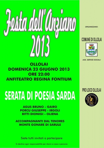 Ollolai. Sarà dedicata agli anziani la serata di poesia sarda promossa per sabato dalla Pro loco. Una vera festa dell'anziano che si terrà nell'anfiteatro Regina Fontium a cominciare dalle 22. Parteciperanno Bruno Agus di Gairo, Giuseppe Porcu di Irgoli e Dionigi Bitti di Oliena che saranno accompagnati dai tenores monte Gonare di Sarule.