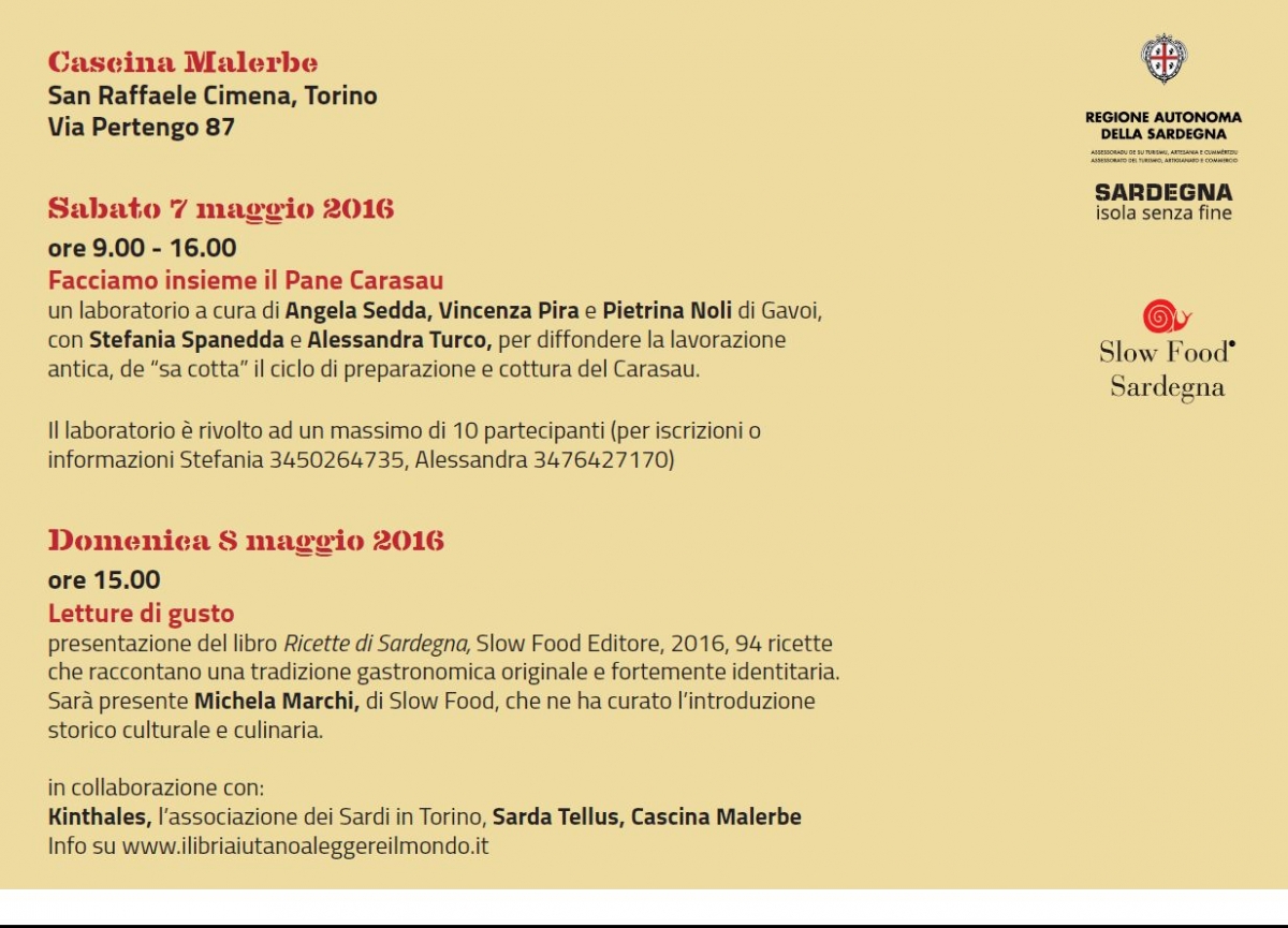 Facciamo insieme il pane carasau è il nome della manifestazione organizzata per sabato 7 e domenica 8 maggio dall'Associazione Malik, in collaborazione con Kinthales l’associazione dei Sardi in Torino e Sarda Tellus. La manifestazione rientra all'interno di Letture di gusto del progetto I Libri aiutano a leggere il mondo 2016. L’evento è ospitato dalla Cascina Malerbe, un luogo magico sulle colline piemontesi di San Raffaele Cimena (20 km da Torino).
