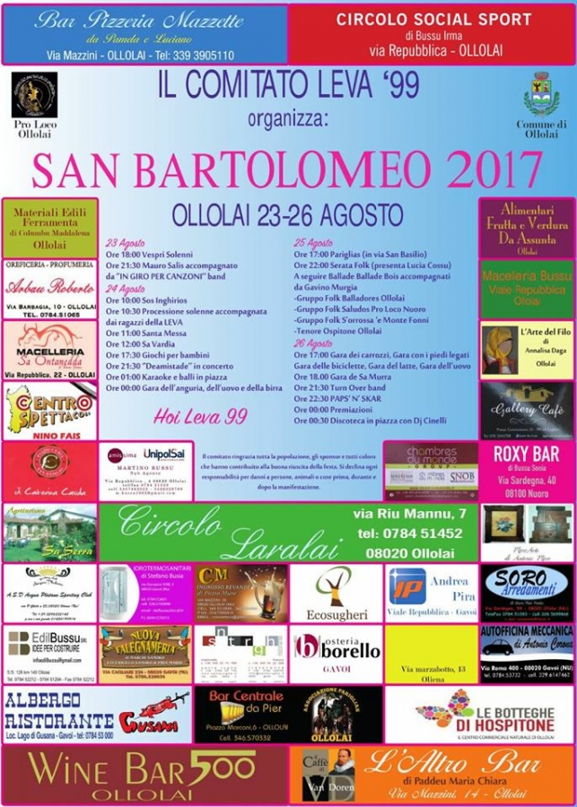 Con la designazione di su ghionarzu di ieri sera si è dato inizio ufficialmente ai riti per la festa di San Bartolomeo, la più sentita dagli ollolaesi. Ad organizzare è la leva del '99 i diciottenni che hanno approntato il cartellone per i quattro giorni di festa.