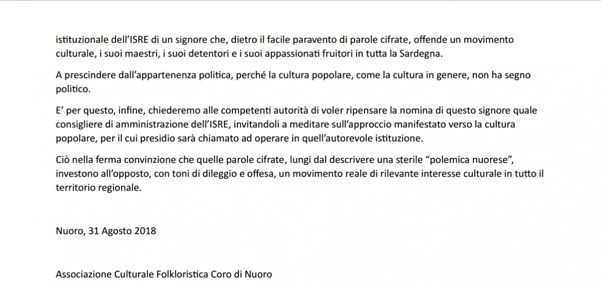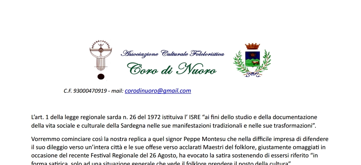 La lettera aperta del Coro di Nuoro sulle polemiche innescate dal Consigliere Comunale Montesu