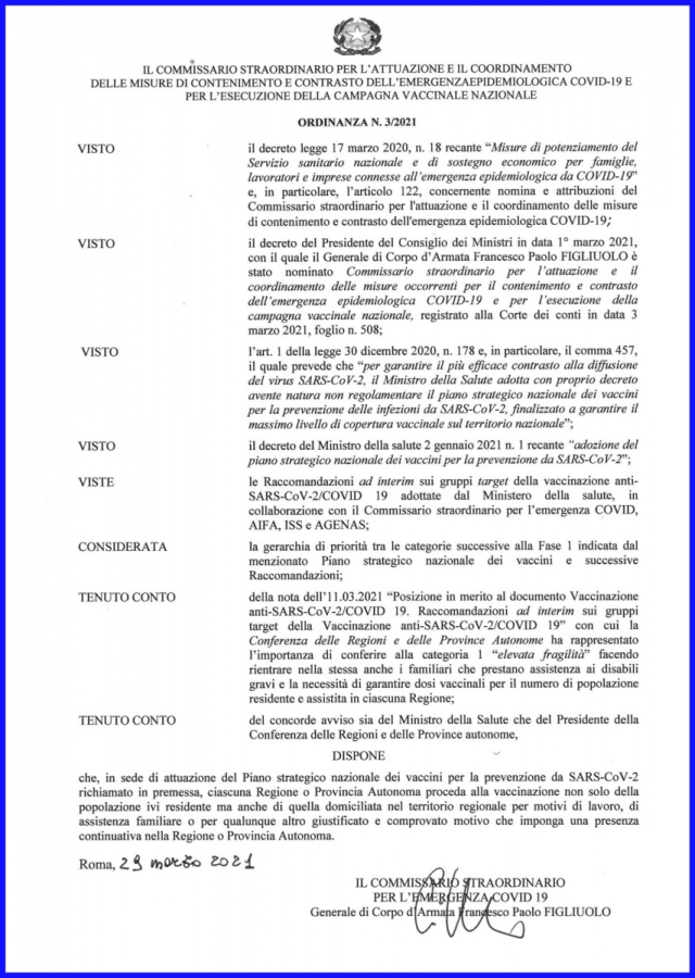 Redazione. Il commissario per l’emergenza Covid Francesco Paolo Figliuolo ha firmato un’ordinanza (la numero 3 del 29 marzo 2021) dove è previsto che ciascuna Regione possa vaccinare tutta la popolazione domiciliata, e non solo quella residente.