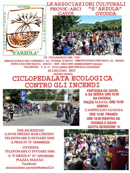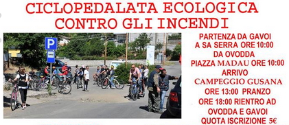 Si rinnova domani, per il diciannovesimo anno, la ciclopedalata contro gli incendi. Iniziativa nata con la Prociv-Arci di Gavoi che da qualche anno ha trovato la collaborazione dell’associazione S’Arzola di Ovodda. “Si tratta di una giornata di festa e riflessione – commenta Giorgio Lai, presidente dell’associazione di volontariato gavoese – che condividiamo con gli amici ovoddesi ma aperta a tutti”. La giornata si aprirà alle 10 con la partenza dai due paesi barbaricini: da piazza sa Serra a Gavoi, da piazza Madau a Ovodda. Da lì i serpentoni a due ruote si sposteranno lungo la statale 128 per incontrarsi nella vecchia cantoniera di San Pietro. “La manifestazione ha lo scopo – continua Lai – di sensibilizzare le nostre popolazioni sul tema ambientale, ed in particolare sulla piaga degli incendi. In Sardegna non abbiamo terremoti ma ogni anno perdiamo centinaia di ettari di bosco a causa del fuoco. Una autentica catastrofe ambientale che ci deve vedere tutti in prima linea”. A fine passeggiata tutti i partecipanti si sposteranno nel campeggio Gusana dove ci sarà un pranzo sociale. (La locandina sotto)