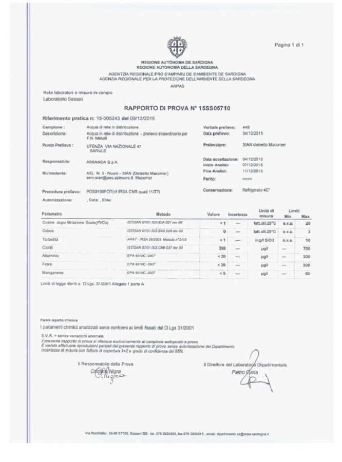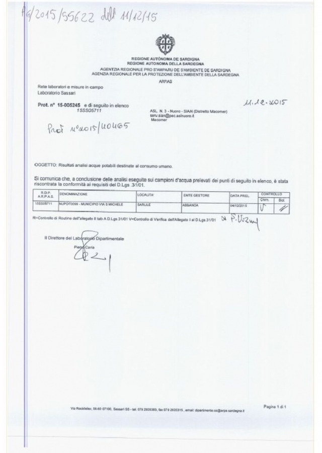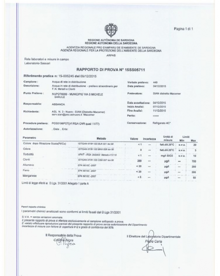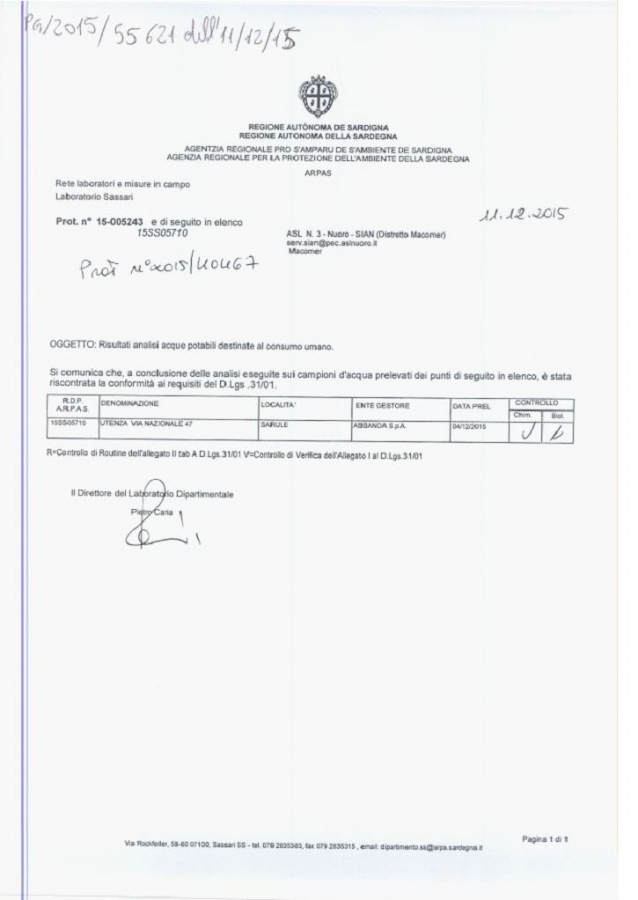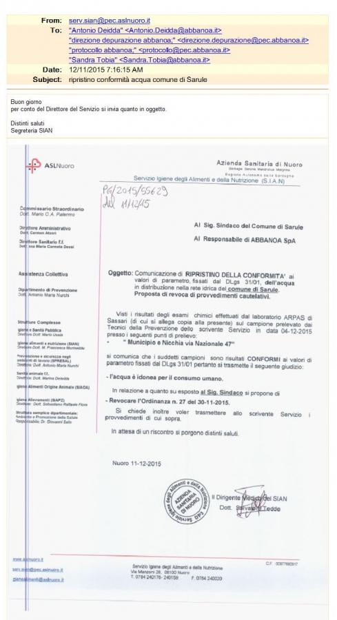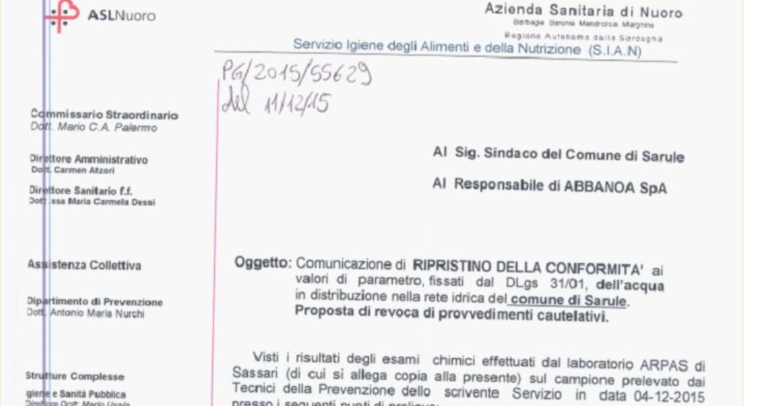 Il Sian infatti, l’ente della Asl che svolge le analisi dell’acqua in rete e che comunica ai municipi la situazione di potabilità o non potabilità, ieri ha dato il via libera al consumo solo per i paesi di Orani e Oniferi. Di oggi il documento invece della Asl, ricevuto dai tecnici di Abbanoa i quali ce l'hanno inviato, che certifica che a Sarule l'acqua è potabile. Documento sul quale si legge come destinatario il sindaco del Comune, ma che però non è giunto a destinazione. (Trovi il documento nella galleria allegata)